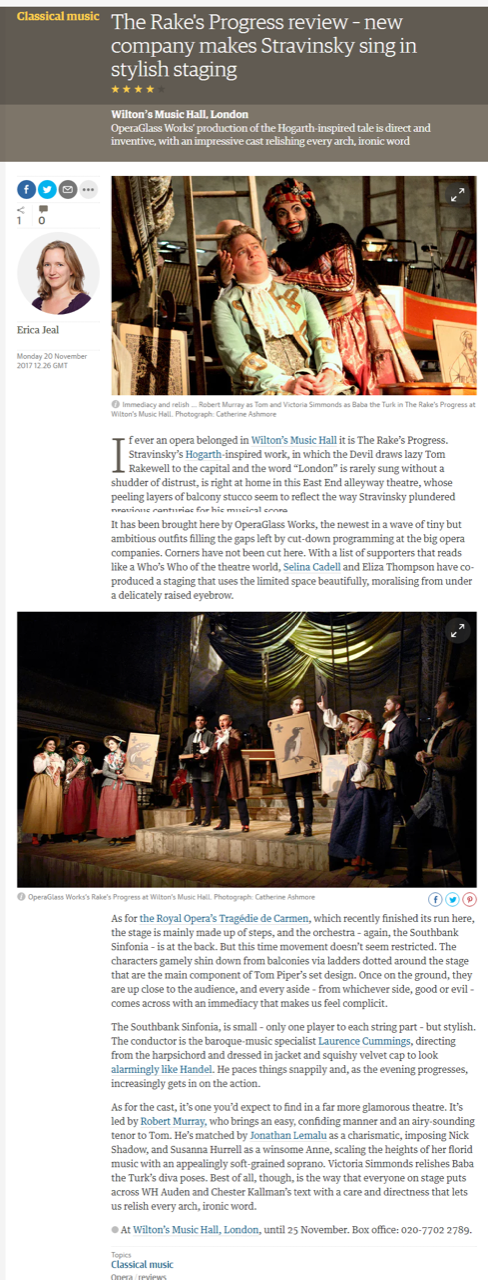 “Going by this impressively assured first production, OperaGlass Works have a bright future: this Rake was a textbook statement of how visceral opera can be and how much fun it should be”